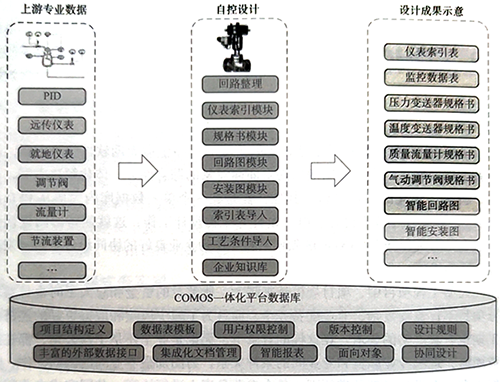 在COMOS軟件平臺中,FEED模塊用于開展前期工藝包設計,隨后工藝包數據可以通過接口傳遞給COMOS P&ID模塊,然后開始進行工程項目的基礎設計。基礎設計開始以后,以項目的P&ID圖作為工程設計的源頭,所建立的設備、管道、儀表等對象及其屬性被其他的專業和后續設計及工廠管理、運營階段反復使用和關聯。P&ID圖完成以后,電氣、自控專業在該平臺建立電氣設備和儀表的位號對象,再使用其中的EI&C模塊進行電儀專業工程設計,自控設計人員在位號對象建好以后,使用COMOS邏輯圖模塊設計控制邏輯圖及DCS機柜等自動控制系統。COMOS軟件平臺結構如圖1所示。