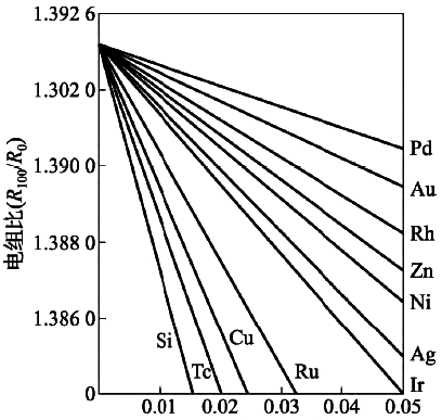 通過(guò)大量的數(shù)據(jù)積累,通常認(rèn)為R100/R0≥1.3920的鉑絲其化學(xué)純度≥99.99%,反之則未必。究其原因,GB/T 1419-2015《海綿鉑》中需要分析的雜質(zhì)元素雖然由1989版的11個(gè)增加到2015版的18個(gè),但實(shí)際上部分未涉及的雜質(zhì)元素對(duì)鉑絲電阻比的影響仍有待進(jìn)一步深入研究,部分雜質(zhì)元素對(duì)鉑電阻比的影響如圖2所示。