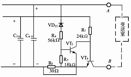 ①電源出現過電壓:圖3中齊納二極管VD15的擊穿電壓約為30V。如果濾波電容C4上的整流電壓超過30V,則齊納二極管VD15 導通,經電阻R4向晶體管VT3的基極提供電流,VT3導通且奪取VT4的基極電流,使VT4趨于關斷,送往現場的電壓UAB減小,起