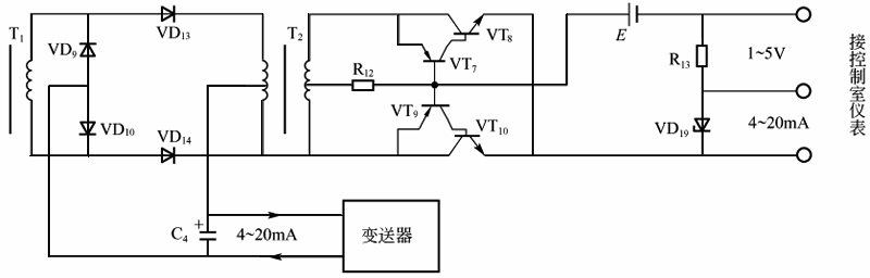 VD10、VD13、VD14全波整流供給的。由于VD13和VD14是在電源正負半波交替工作的,因此將變壓器B2初級線圈的上下兩半分別接入這兩個二極管支路中時,在VD13、VD14的開關作用下,變送器的4-20mA直流信號電流將交替地進入變壓器初級線圈的上下兩部分,使其次級出現方波電壓。這里,變壓器T2工作于電流互感器的工作方式,其次級負載阻抗很小。這樣,在初次級線圈匝數比為1:1的情況下,次級方波電流大小等于初級電流。