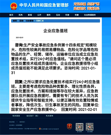 國家安全生產應急救援中心回復:之所以要求應急處置技術組實行24小時應急值班,主要是考慮危險物品種類繁多、理化性質各異,應急處置技術、方案和措施等存在較大差異,應急救援隊伍開展應急救援時,需要有專門的技術人員為其提供專業指導和智能支持,以便正確有效處置險情或者事故,降低次生、衍生事故發生的風險。回復單位: 國家安全生產應急救援中心 回復時間: 2021-02-01