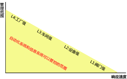 我們知道:過(guò)去工廠里的計(jì)算機(jī)系統(tǒng)是分級(jí)的。離散制造業(yè)典型的分法是BA、MES、ERP,鋼鐵行業(yè)的典型分法是L1~L4。這些級(jí)別的特征是:底層的響應(yīng)速度快而管控范圍小,高層響應(yīng)速度慢而管控范圍大。以鋼鐵行業(yè)為例,L1是閥門級(jí)、L2是設(shè)備級(jí)、L3是車間級(jí)、L4是公司級(jí),范圍不斷擴(kuò)大。但L1的響應(yīng)速度是秒級(jí)、毫秒級(jí),而L4并不是實(shí)時(shí)處理的。把管控范圍和響應(yīng)速度放在一起,就能看到原來(lái)計(jì)算機(jī)系統(tǒng)的局限性:限于相應(yīng)速度慢或者管理范圍小的三角形內(nèi)部。