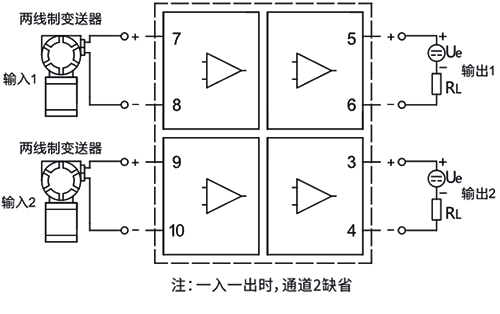 6、輸入側(cè)接兩線制4-20mA變送器,輸出側(cè)輸出兩線制4-20mA信號(hào)