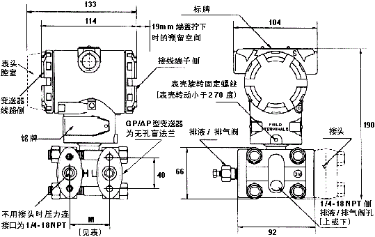 4、3051DP輸出:兩線制4-20mA;數字過程變量疊加在4-20mA信號上,可供采用HART協議的上位機使用