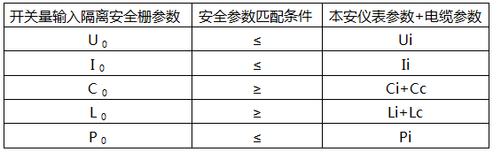 ②開關量輸入隔離安全柵和現場本安儀表之間各自的認證參數明確,且符合下列不等式,這樣構成回路可認為是本安回路系統。