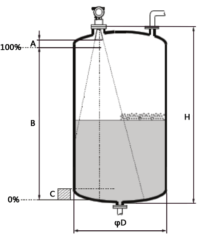 ◆理論上測量范圍可達雷達液位計的頂端。但事實是每一種雷達液位計都有測量盲區A,考慮到腐蝕及粘附的影響,測量范圍的終端距天線頂端的距離應大于雷達物位計盲區A。