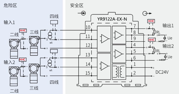 ③二進二出YR9122A-EX檢測端隔離式安全柵接線圖