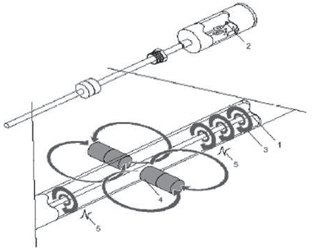 主要是利用磁致伸縮的物理特性進(jìn)行測(cè)量,不受介質(zhì)的介電常數(shù)、溫度或壓力變化的影響。如圖1所示,在非磁性傳感管的內(nèi)部有一根拉緊的磁致伸縮線1,電路單元沿磁致伸縮線發(fā)射電流脈沖2,從而在磁致伸縮線周?chē)a(chǎn)生一個(gè)環(huán)形的磁場(chǎng)3,液位浮子內(nèi)有一組永久磁鋼4,它們本身的磁場(chǎng)使磁致伸縮線沿軸向磁化。當(dāng)電流磁場(chǎng)和磁鐵磁場(chǎng)疊加,浮子位置的磁致伸縮伸縮線將產(chǎn)生一個(gè)瞬時(shí)扭力5,同時(shí)產(chǎn)生返回脈沖,該脈沖沿磁致伸縮線向兩端傳送,一端傳向傳感管的頂端,另一端傳向傳感管的底部。其中向頂端返回的脈沖波會(huì)被變送器電子單元所接收。由于脈沖波的傳播速度是恒定值,電子單元只需通過(guò)起始脈沖和返回脈沖的時(shí)間差就可以計(jì)算出浮子中磁鋼的位置,從而得到精確的液位。
