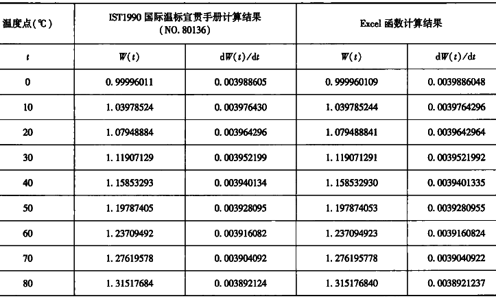 在Excel計(jì)算中,將W(t)、dW(t)/dt的計(jì)算結(jié)果比IST-1990國際溫標(biāo)宣貫手冊(cè)中多保留一位。從表1中可以看出,跟IST-1990國際溫標(biāo)宣貫手冊(cè)的計(jì)算結(jié)果是一致的,這也證明了采用該計(jì)算方法的可靠性。同樣,也可以采用該方法計(jì)算其他溫度段的分度值。