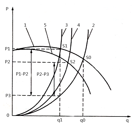 圖4所示為風(fēng)機(jī)入口節(jié)流控制特性曲線,與出口控制相比,當(dāng)入口擋板關(guān)小時(shí)、不僅管路曲線變陡(由曲線2變?yōu)榍€4),而且風(fēng)機(jī)性能曲線也變陡(由曲線1變?yōu)榍€5),這是因?yàn)槿肟诠?jié)流后,風(fēng)機(jī)入口前壓力降低,風(fēng)機(jī)性能曲線形狀當(dāng)然也要受到影響。為減小流量,用入口控制可將工作點(diǎn)S0移到S2,此時(shí)節(jié)流損失為P2-P3;若用出口控制、則工作點(diǎn)需要移到S1點(diǎn),節(jié)流損失為P1-P3。比較兩者,PI-P3>P2-P3,可見入口節(jié)流控制比出口節(jié)流控制要經(jīng)濟(jì)一些,所以離心機(jī)多采用入口控制擋板控制。但是,對于水泵來說,如果采用入口節(jié)流控制會使泵進(jìn)口壓力降低,泵容易發(fā)生氣蝕,所以泵一般不采用入口端節(jié)流控制。