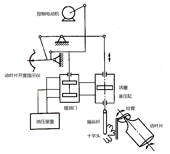 動(dòng)葉控制機(jī)構(gòu)的基本控制過程是:操縱電動(dòng)機(jī)(伺服機(jī))接受鍋爐控制系統(tǒng)來的信號,通過杠桿使錯(cuò)油門活塞偏離中間位置(假設(shè)向上),油壓裝置來的壓力油經(jīng)錯(cuò)油門和油管路進(jìn)入液壓缸活塞下,使液壓缸油活塞向上,帶動(dòng)操縱桿和十字頭也向上,通過拉臂使動(dòng)葉片轉(zhuǎn)動(dòng)。在液壓缸活塞向上的同時(shí),通過杠桿傳動(dòng)機(jī)構(gòu),使錯(cuò)油門活塞回到中間位置,同時(shí)也指示了動(dòng)葉片的旋轉(zhuǎn)角度(或開度)。