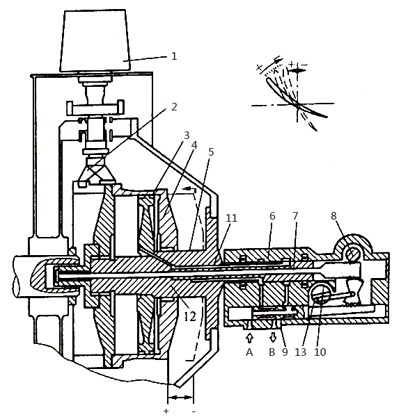 備注:1-葉片;2-控制桿;3-活塞;4-油缸;5-接收軸;6-控制頭;7-位置反饋桿;8-顯示輸出軸;9-控制滑閥;10-伺服電動(dòng)機(jī)輸入軸;11-油通路;12-油通路;13-滑塊;A-壓力油口;B-回油口