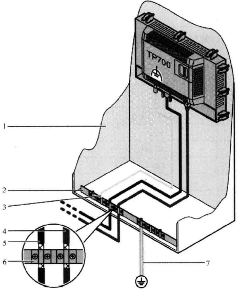 說明:1為控制機柜;2為等電位連接導軌;3為等電位連接電纜;4為PROFINET數據線;5為PROFIBUS數據線;6為電纜夾;7為接地連接