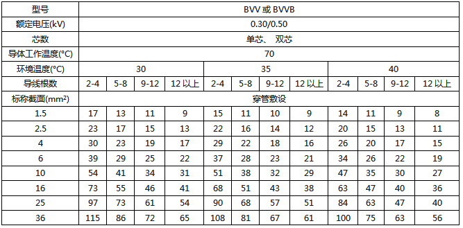 BVV、BVVB絕緣電線穿管暗敷時(shí)持續(xù)載流量