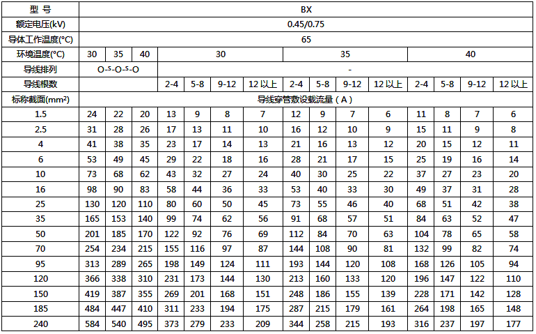 BX絕緣電線明敷及穿管時(shí)時(shí)持續(xù)載流量