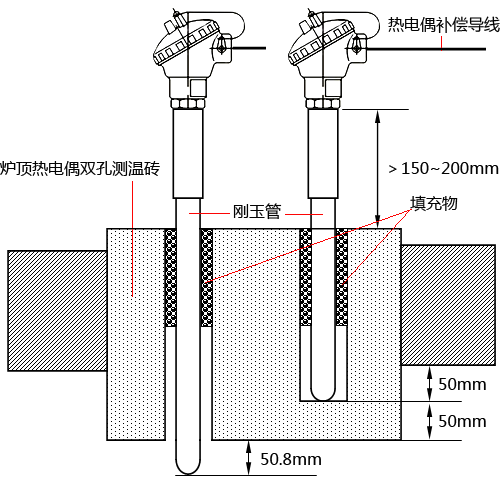 同時插入熱電偶的孔與熱電偶剛玉管之間的空隙,必須要用玻璃棉、玻璃纖維等填充物將此空隙堵嚴,以防產生“煙囪效應”(Chimney Effect),使火焰從空隙處沖出燒毀熱電偶與補償導線等。