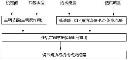 從圖1知,汽包水位調(diào)節(jié)器的輸出信號(hào)作為外給定調(diào)節(jié)器控制信號(hào)、蒸汽流量信號(hào)、給水流量信號(hào)(負(fù)信號(hào))一同送進(jìn)減法器進(jìn)行運(yùn)算,減法器的輸出作為外給定調(diào)節(jié)器測(cè)量信號(hào),外給定調(diào)節(jié)器輸出控制調(diào)節(jié)閥的開度。