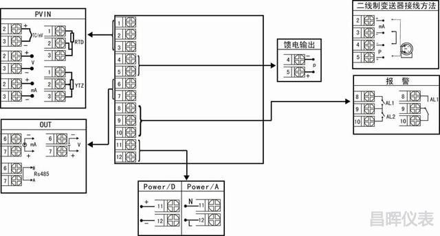 用顯示控制儀上限和下限報警構(gòu)成的溫度控制系統(tǒng)電氣二次控制原理圖與圖3完全相同,在此以昌暉儀表YR-GFC803-01顯示控制儀為例,介紹溫度傳感器和儀表的接線: