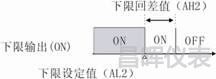 智能顯示控制儀報警輸出均為位式ON/OFF帶回差,指針儀表沒有“回差”這個功能。回差可以防止顯示控制儀輸出繼電器在報警輸出臨界點上下波動時頻繁動作,具體輸出狀態(tài)如下: