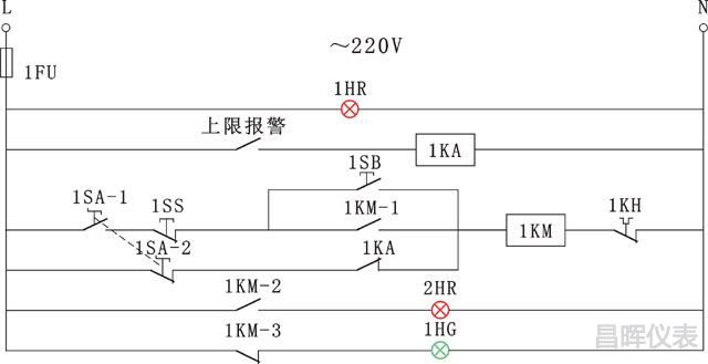 1FU為電氣二次回路電源熔斷器;1HR為二次回路電源指示燈(紅);2HR為運行指示燈(紅);1HG為停機指示燈(綠);1KA、2KA為中間繼電器;1SA為無自復位旋轉(zhuǎn)開關(guān)(最好使用三擋旋轉(zhuǎn)開關(guān),中間位置為加熱強制停止,兩側(cè)為自動或手動工作模式);1SS為停止按鈕;1SB為啟動按鈕;1KM為接觸器;1KH為熱繼電器;上限和下限報警觸點來自于電接點溫度計儀表。
