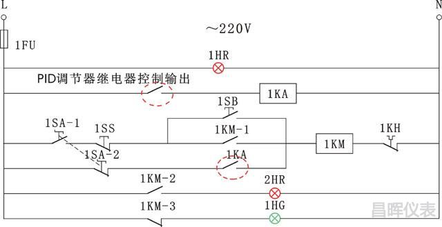 溫控器+接觸器構(gòu)成的溫度控制系統(tǒng)電氣二次控制原理圖如所示,此時必須選擇繼電器控制輸出的溫控器。