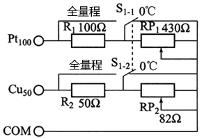當(dāng)將開關(guān)S1扳至“全量程”位置時(shí),它把R1及R2電阻短接了,這時(shí)從Pt100端與COM端輸出的可調(diào)電阻值為10-430Ω,可滿足 Pt110熱電阻測(cè)溫范圍從-200~850℃時(shí)對(duì)應(yīng)的電阻值;而從Cu50端與COM端輸出的可調(diào)電阻值為5-82歐姆,可滿足Cu50熱電阻測(cè)溫范圍為-50~150℃時(shí)對(duì)應(yīng)的電阻值。