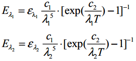 設長波(紅外線)波長為λ1,短波波長為λ2,光譜發射率分別為ελ1和ελ2,根據普朗克定律,兩種波長的輻射能量為