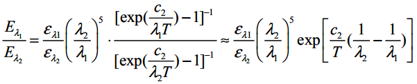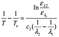 比色高溫計是按照黑度刻度的,用這種刻度的高溫計去測量實際物體,所得到的溫度示值為被測物體的“顏色溫度”。若黑體在λ1和λ2兩種波長下,在溫度為TS時的輻射能量之比和實際物體在溫度T時的輻射能量之比相等,則TS為該物體的“顏色溫度”,二者之間存在以下關系
