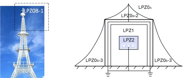 ②LPZ 0B區:本區內的各物體不可能遭到大于所選滾球半徑對應的雷電流直接雷擊,但本區內的電磁場強度沒有衰減。