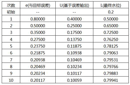 方案一仍是使用P(比例控制)U=Kp×e,仍然設Kp=0.5. 則U=0.5×e,L(最終水位)=本次輸入U加上上一次水位。