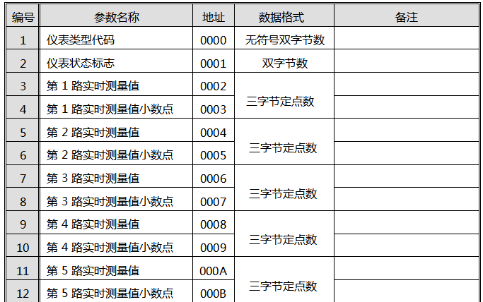注2:寄存器數據為雙字節,高位在前。