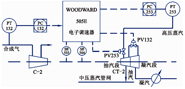 因此PV253與PV132閥的開度和高壓蒸汽的耗氣量、透平的轉速、抽汽有著密切關系。同時由于PV253控制合成氨裝置高壓蒸汽管網的壓力,因此100CT2的穩定運行是合成氨裝置穩定運行的重要保障。100CT2的調速系統采用美國伍德沃德505調速器,主要實現壓縮機組的啟動控制和運行時的轉速與抽汽壓力控制。