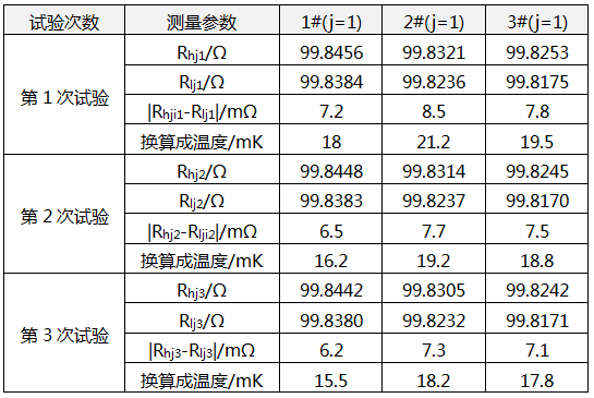 使用三支鉑絲型鉑電阻溫度計按照以上方法進行熱遲滯性試驗,測得三次在0℃的熱遲滯性數(shù)據(jù),分別為:|Rhj1-Rlj1|、|Rhj2-Rlj2|和|Rhj3-Rlj3|。