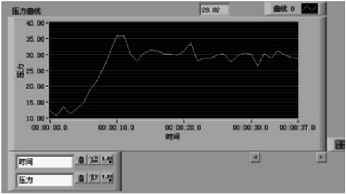 整個系統通過由DAQ模塊來采集主管路瞬時壓力,傳輸到PID調節器,通過PID調節器設置PID參數,對系統進行實時調節,并將控制輸出送給變頻器,來控制水泵的轉速進而控制水的流量來調節主管路的實時壓力。系統運行效果圖如下圖所示。