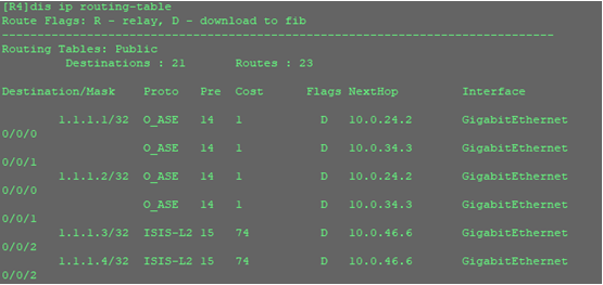 可以看到AR4的路由表中已經存在1.1.1.1/32和1.1.1.2/32的主機路由,說明引入成功。