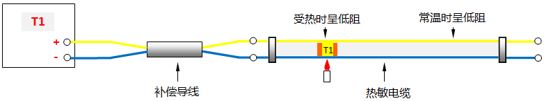 當熱點探測器上任何一點(T1)的溫度高于其它部分的溫度時,該處的熱電偶導線之間的絕緣電阻(R)降低,從而出現“臨時”熱接點,相當于點式熱電偶的金屬熱接點,作用與普通熱電偶的熱接點相同,如圖1所示。