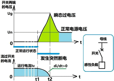 注意1:隨著負載電流(實際上就是電弧電流)不斷減小,電流對時間的變化率反而越來越大,并且在接近于 t2 時刻,電流對時間的變化率di/dt達到最大值,電感的反向電動勢電壓也達到最大值,我們把它叫做過電壓。
