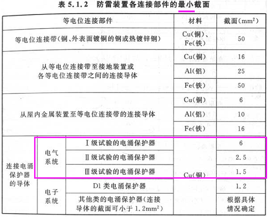 5.1.2 防雷等電位連接各連接部件的最小截面,應(yīng)符合表5.1.2的規(guī)定。連接單臺(tái)或多臺(tái)Ⅰ級(jí)分類實(shí)驗(yàn)或D1類電涌保護(hù)器的單根導(dǎo)體的最小截面,尚應(yīng)按下式計(jì)算:Smin≥Iimp/8,公式中Smin為單根導(dǎo)體的最小截面(mm2);Iimp為流入該導(dǎo)體的雷電流(kA)。