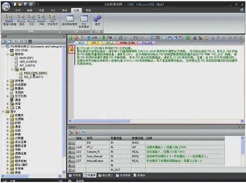 查看向?qū)傻捻?xiàng)目組件。在項(xiàng)目樹中展開程序塊下的向?qū)募A,雙擊初始化PID子程序打開,該子程序是加密的,可以查看相關(guān)的子程序調(diào)用說明,變量表列出了子程序的接口參數(shù)定義,編程調(diào)用時可參考。雙擊PID功能中斷子程序打開,該中斷子程序也是加密的,請注意PID向?qū)褂昧硕〞r中斷0,編程時不能再使用此中斷,否則會引起PID運(yùn)行錯誤。
