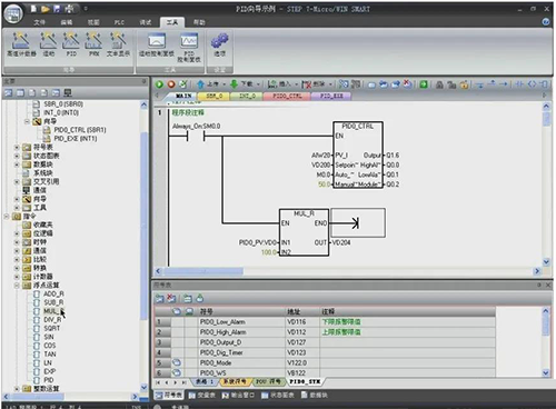 插入實(shí)數(shù)相乘指令,在IN1處輸入地址VD0,IN2處輸入100.0,OUT處輸入地址VD204,該指令把標(biāo)準(zhǔn)化的過程變量轉(zhuǎn)化成了實(shí)際溫度值存放在VD204中。對使用的地址進(jìn)行符號定義,如下圖所示,這樣通過調(diào)用PID向?qū)傻淖映绦蚴箿囟缺3衷诮o定值的程序就編寫完成了,最后,保存編譯項(xiàng)目。