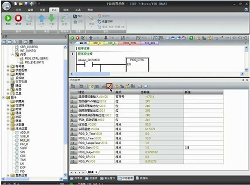 在工具菜單功能區(qū)單擊PID控制面板按鈕,打開PID整定控制面板對話框,選擇回路0,先啟動手動調(diào)節(jié),輸入PID參數(shù),如增益改為5.0,單擊更新CPU,使新輸入的參數(shù)值起作用,監(jiān)視趨勢圖,根據(jù)調(diào)節(jié)狀況改變PID參數(shù)直至調(diào)節(jié)穩(wěn)定,即過程值與設(shè)定值接近,且輸出沒有不規(guī)律的變化,并最好處于控制范圍中心附近,此時可將手動調(diào)節(jié)改為自動調(diào)節(jié),即自整定。