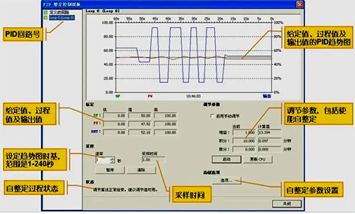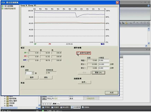 自整定。要使用PID控制面板必須與CPU通信,用PID向?qū)渲蒙梢粋€PID回路,并將程序下載到CPU中,使CPU處于運(yùn)行模式,在狀態(tài)圖表中將給定值設(shè)為60度,PID控制改為自動模式。