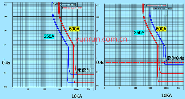 如圖1所示,保護(hù)電氣A,是上下級(jí)關(guān)系,當(dāng)F點(diǎn)發(fā)生短路或過(guò)負(fù)荷故障時(shí),希望保護(hù)電器B動(dòng)作,上一級(jí)A不動(dòng)作。但是如果短路電流超過(guò)10kA,則會(huì)出現(xiàn)A和B同時(shí)動(dòng)作的現(xiàn)象,不滿足選擇型要求(如圖2左)。