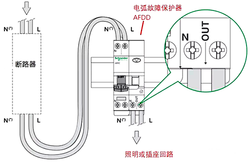 電弧故障保護器應設置在末端配電箱的進線開關下側,其額定電流值應與進線回路保護開關一致;