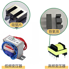 低頻變壓器的鐵芯一般是使用很多片硅鋼片堆疊而成的,而高頻變壓器的鐵芯是用高頻磁性材料(如:鐵氧體)組成的。(所以高頻變壓器的鐵芯一般叫做磁芯)