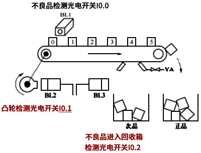 如圖1所示:在傳送帶上有“0”“1”“2”“3”“4”“5”總共6個(gè)工位。機(jī)械手把產(chǎn)品放在第“0”個(gè)工位上,通過(guò)光電開關(guān)(或者視覺)檢測(cè)。當(dāng)機(jī)械手每放入一個(gè)產(chǎn)品,傳送帶移動(dòng)一個(gè)工位。當(dāng)傳送帶每移動(dòng)一個(gè)工位凸輪轉(zhuǎn)一圈(I0.1檢測(cè)到一個(gè)信號(hào))。當(dāng)檢測(cè)到不良品時(shí),到達(dá)第“4”個(gè)工位氣缸推出。當(dāng)不良品(次品)掉入箱體里,I0.2將檢測(cè)到一個(gè)信號(hào)從而氣缸可以縮回。