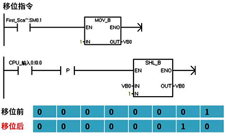 如圖2,SHL_B為左移位指令,IN指的是需要移位的操作數(shù),而N則代表移位的個(gè)數(shù)。程序中VB0的初始值為2進(jìn)制的00000001,左移一位后最高位丟失,整體左移一位,最低位補(bǔ)0,則變成2進(jìn)制的00000010。