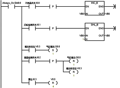 2、當(dāng)移動(dòng)了4次后,VB0中的V0.3位為1,而產(chǎn)品剛好到達(dá)第“4”號(hào)工位,Q0.0為1,氣缸推出。