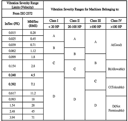 在表格中不難發現,左邊列出了振動烈度的單位,包括速度有效值和位移峰值。