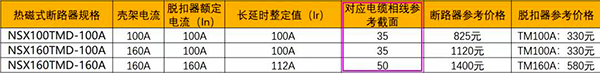 以廣大設計師最容易選擇的情況比對:施耐德規格為NSX100(殼架電流)TMD-100A(脫扣器額定電流)和NSX160(殼架電流)TMD-100A(脫扣器額定電流)和NSX160(殼架電流)TMD-160A(脫扣器額定電流)。
